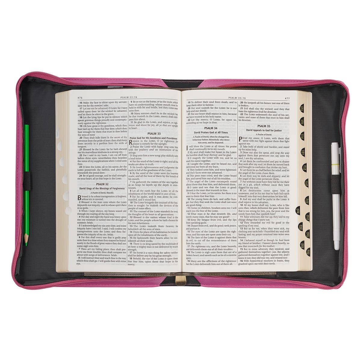 The Amazing Grace Flower Field Pink Faux Leather Fashion Bible Cover will fill your heart with joy as you marvel at God's grace whenever you pick up this protective case to read your Bible.