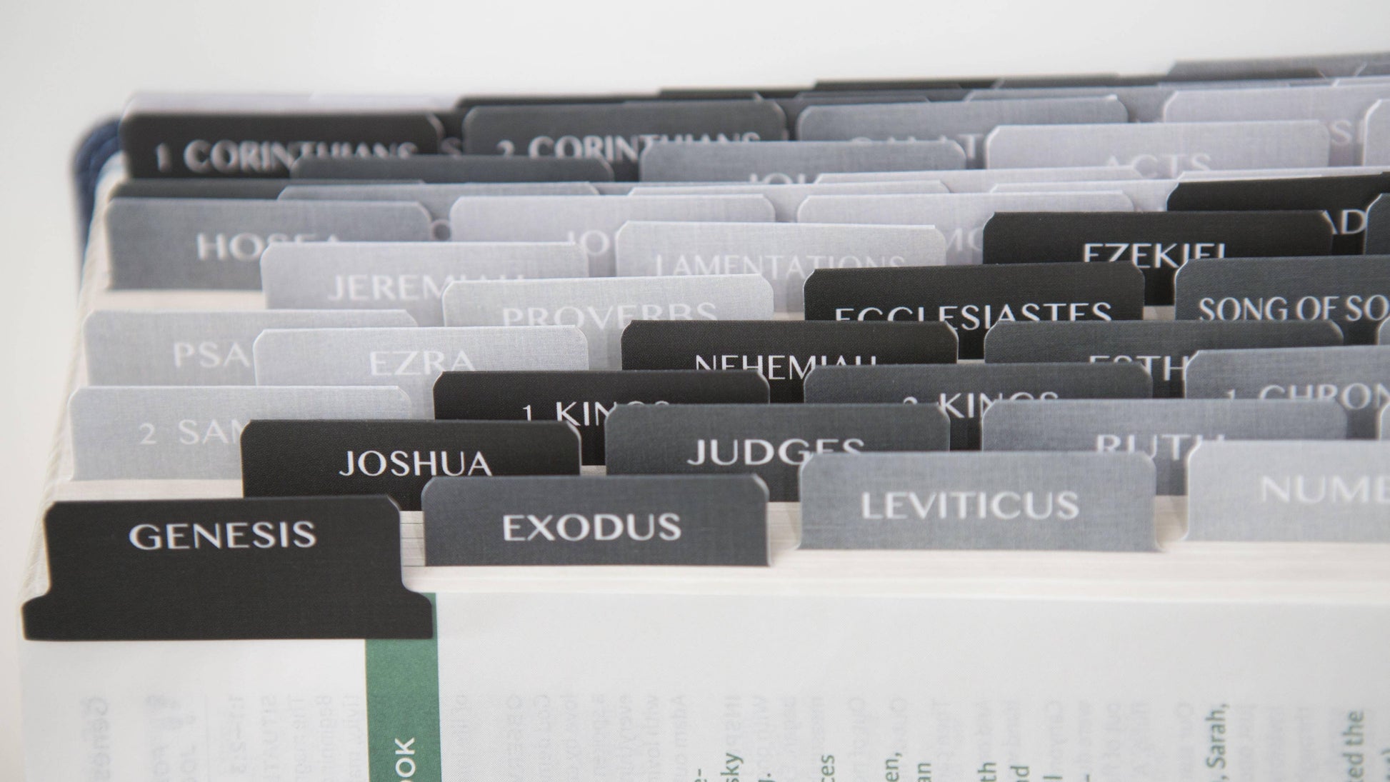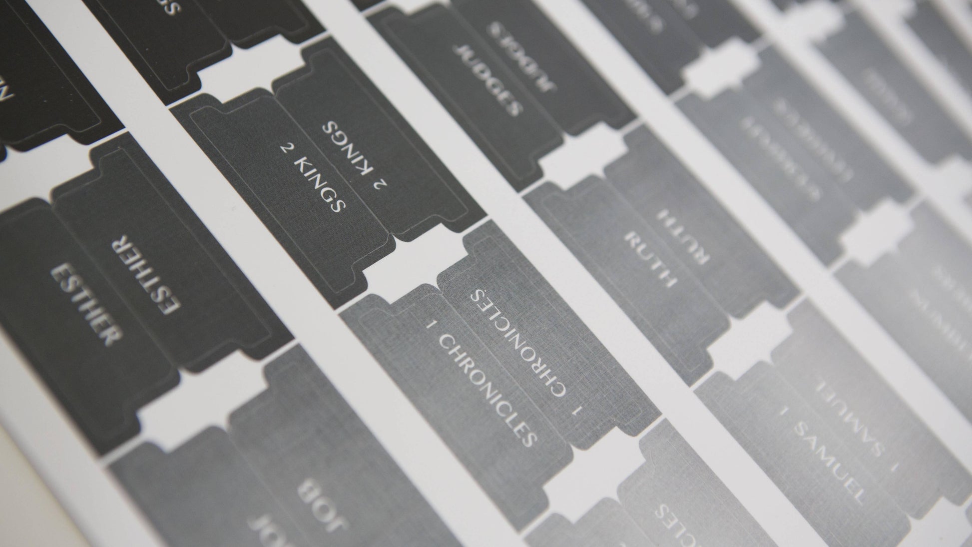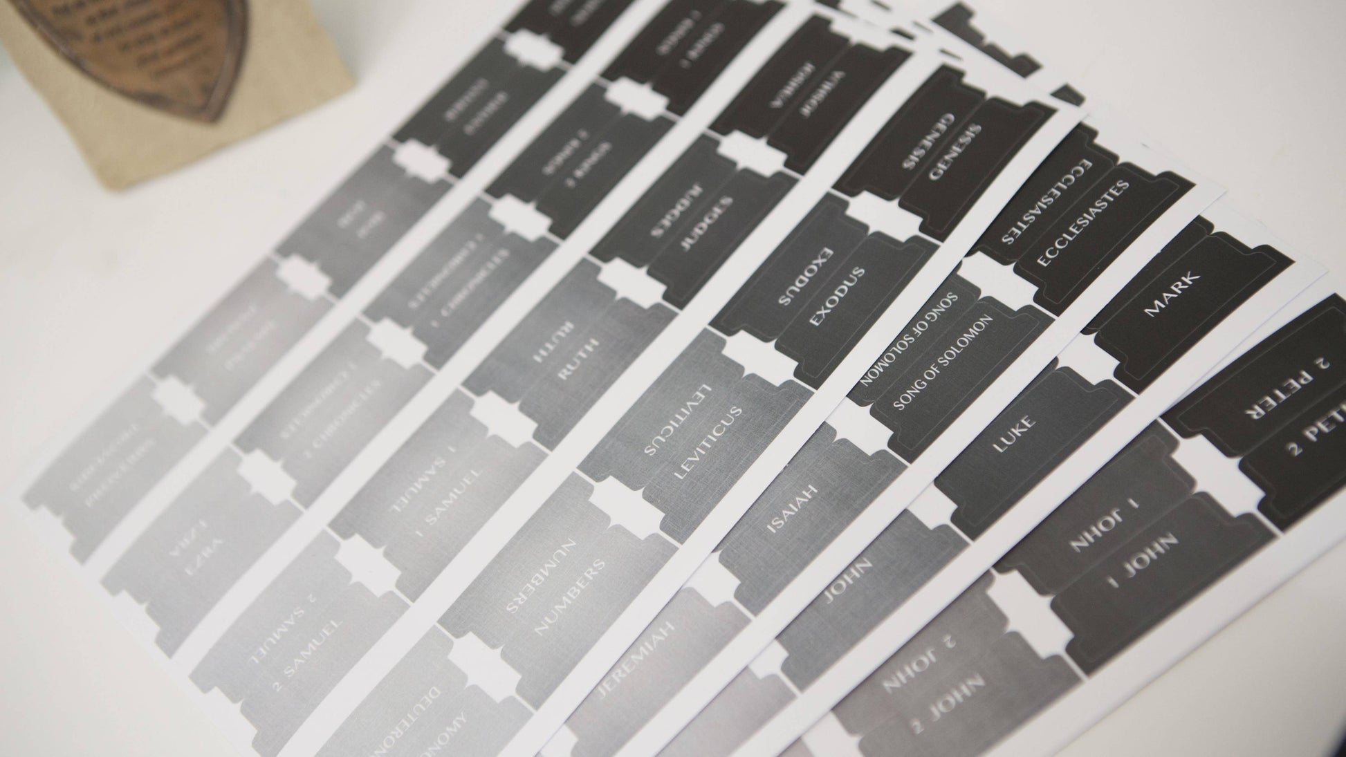 These black and gray self-adhesive Bible index tabs have matte lamination for extra protection and longevity.