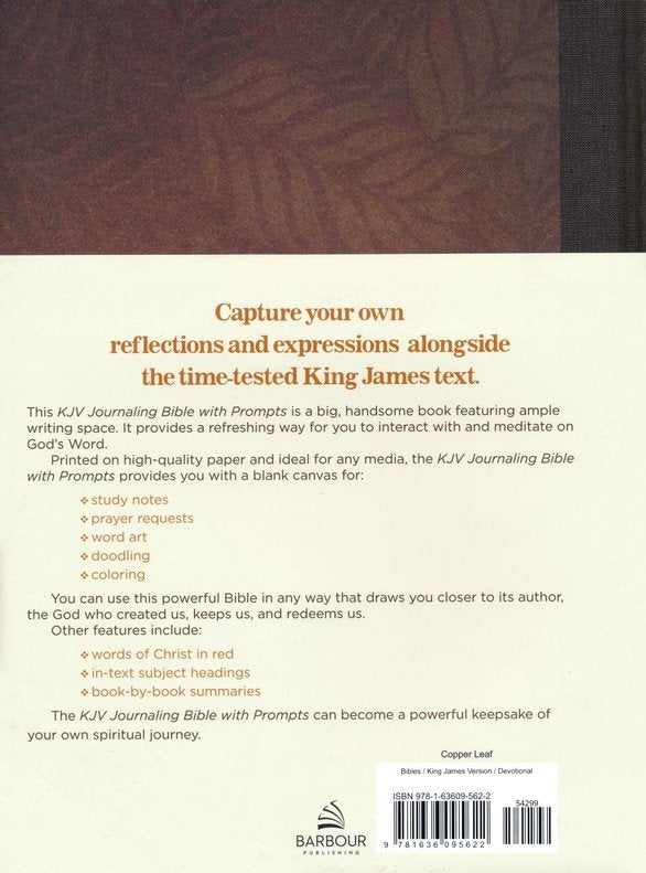 Barbour's KJV Journaling Bible with Prompts is a big, handsome book featuring ample writing space. It provides a refreshing way for you to interact with and meditate on God's Word.