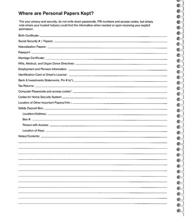 - List of where important papers are kept and what your wishes are regarding funeral, burial, and memorials