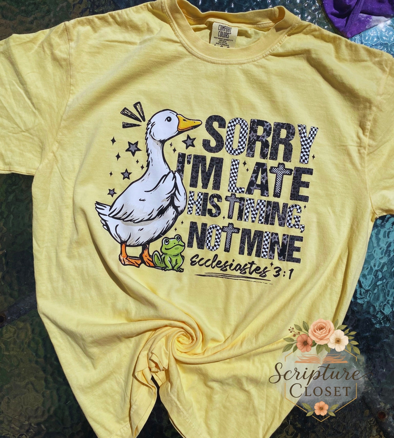 Embrace your faith and sense of humor with our "Sorry I’m Late, His Timing Not Mine Tee"! This quirky religious design features cute ducks and frogs, along with checker and leopard wording. Our DTF print adds a touch of fun to this inspirational and playful tee. Trust in His timing and rock this tee with confidence!