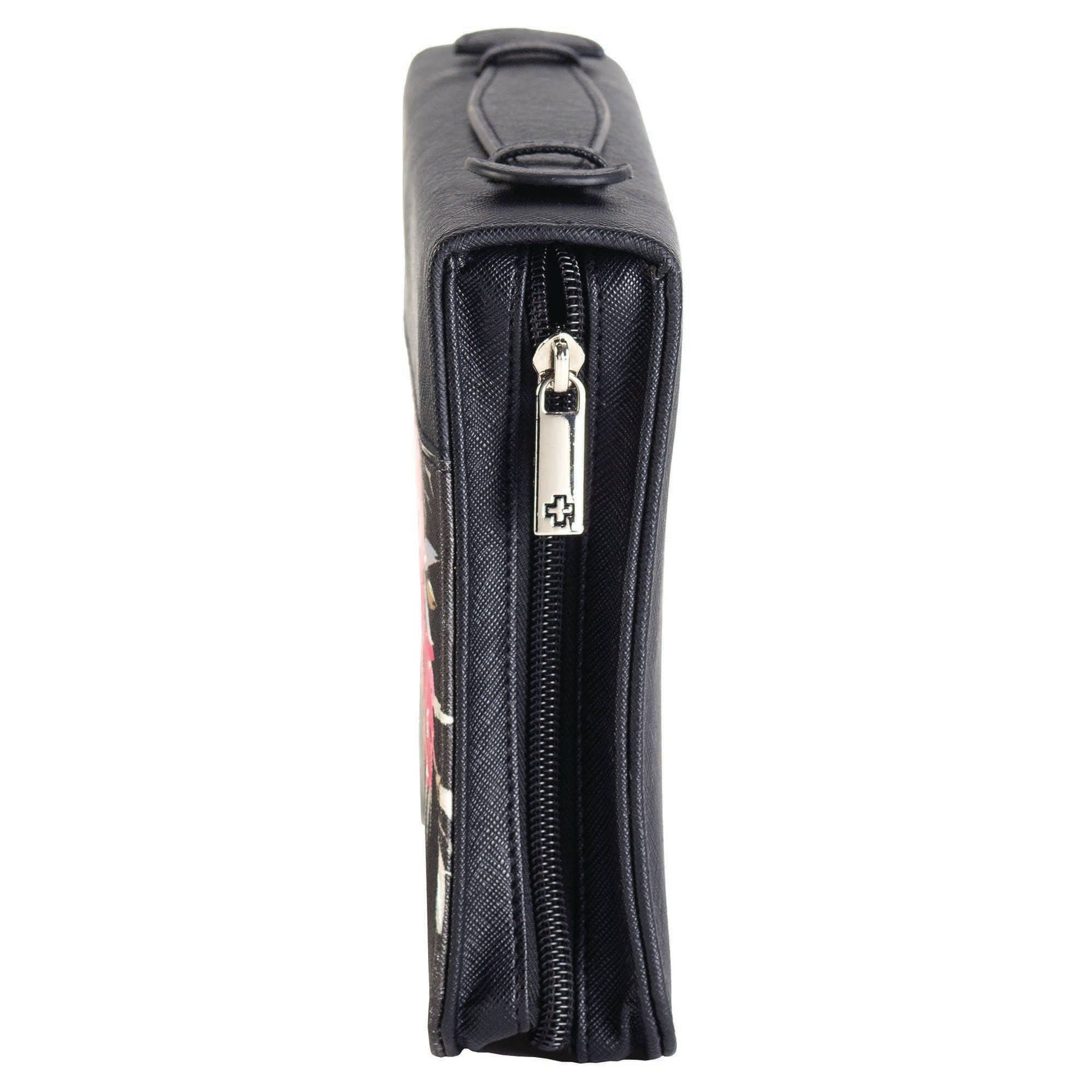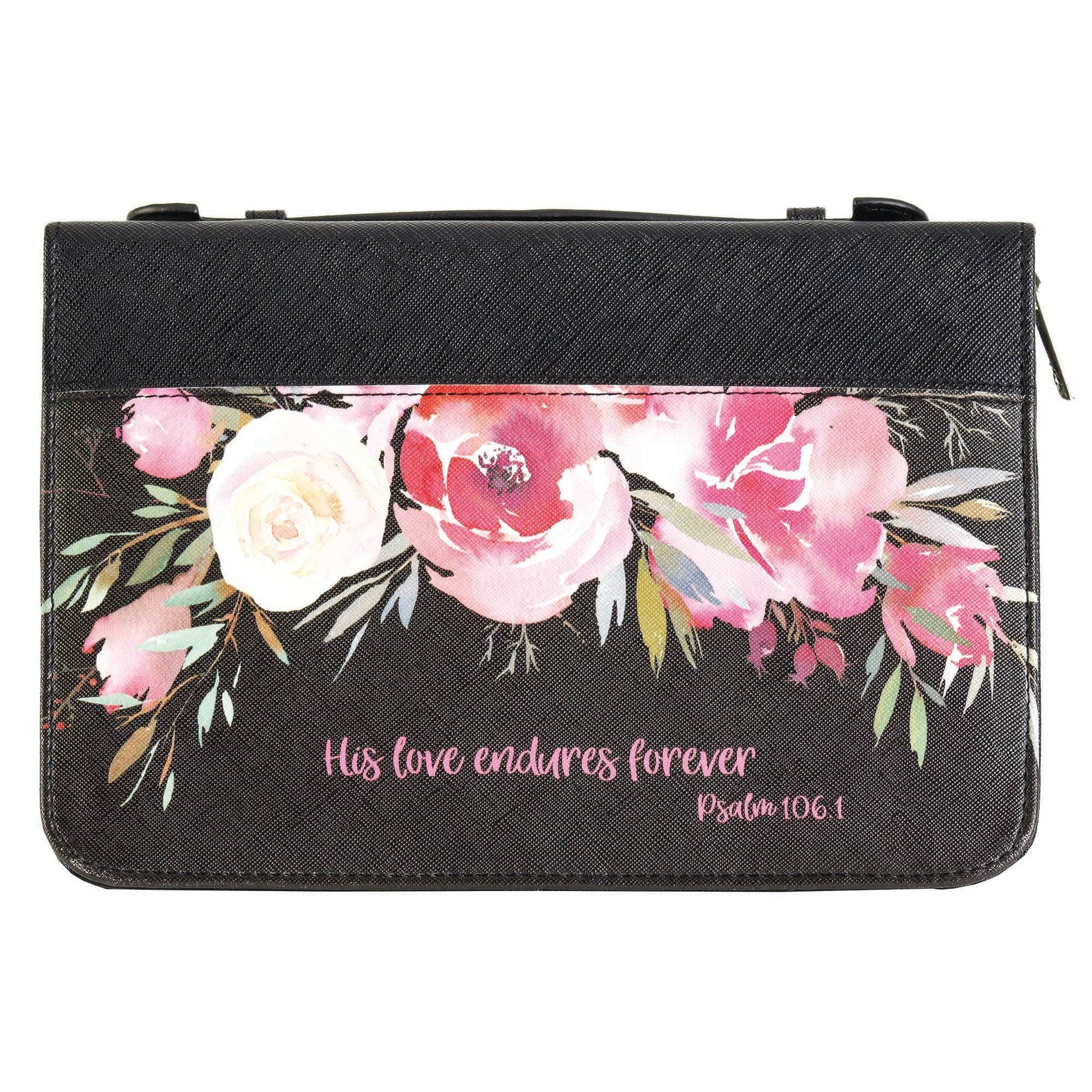 Bible cover with black-colored body and floral accents. Features Psalm 106:1: His love endures forever. Size XL. White Dove design